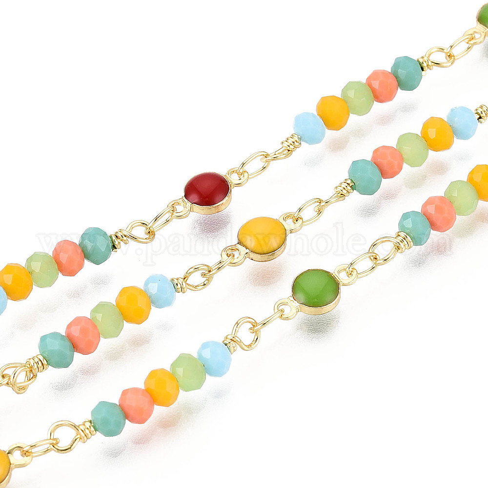 Цепочка из латунной эмали ручной работы с плоскими круглыми звеньями и стеклянными бусинами, с катушкой, пайки, реальный 18 k позолоченный