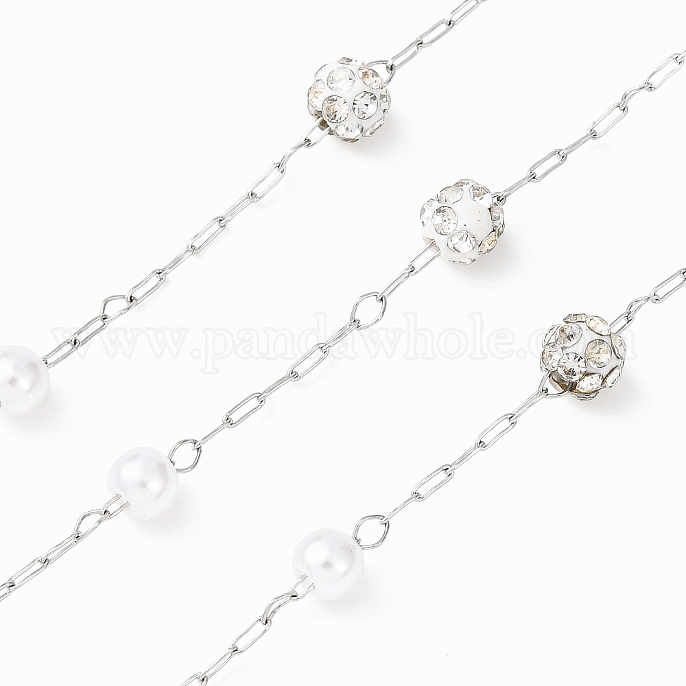 • Нержавеющая Сталь Цвет 304 цепочки из нержавеющей стали и АБС-пластика с круглыми бусинами, кристаллами и стразами из полимерной глины, пайки, с катушкой, цвет нержавеющей стали, 4x3.5 мм