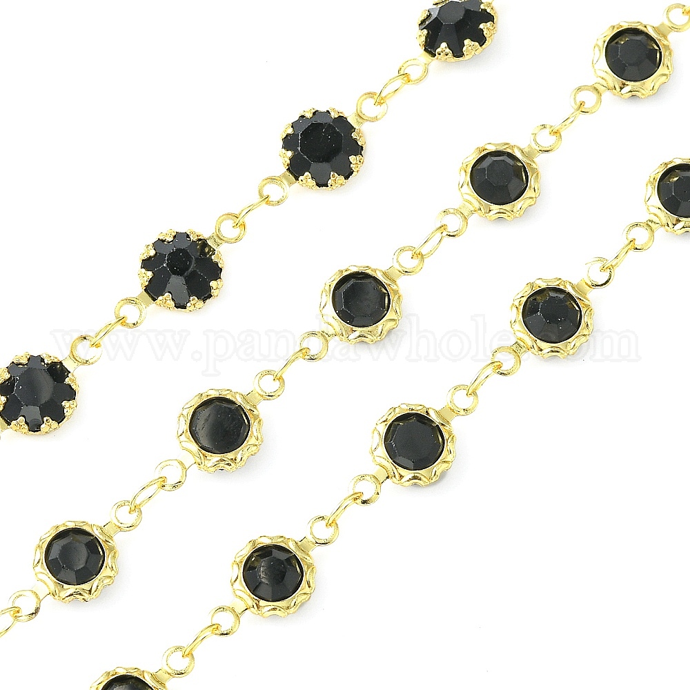 • Черный Латунные соединительные цепи ручной работы, со стеклянными гранеными стразами и катушкой, пайки, долговечный, цветок, чёрные, 12x6.5x3 мм