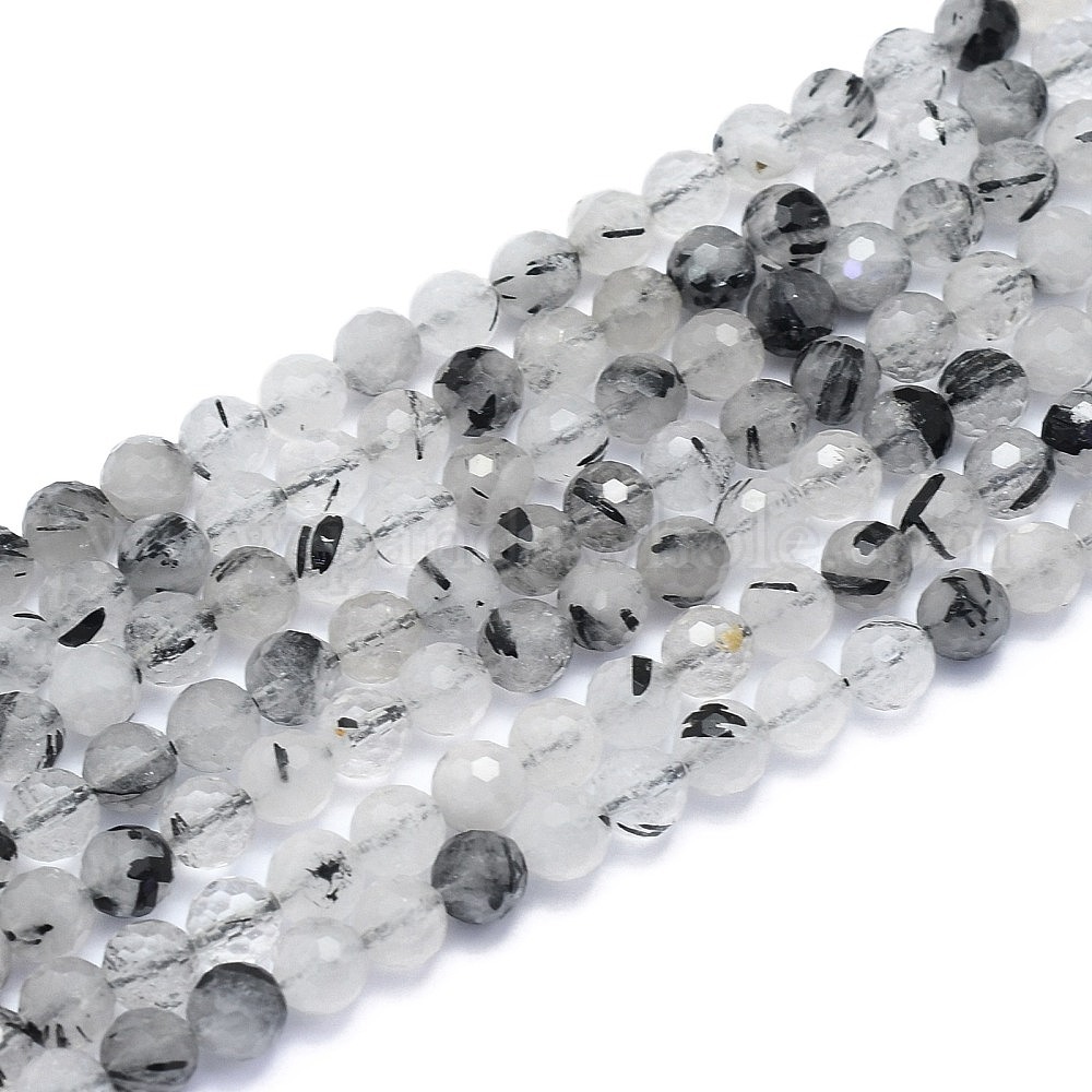 Натуральный черный Rutilated кварцевые нити бисера, круглые, граненый (128 граней)