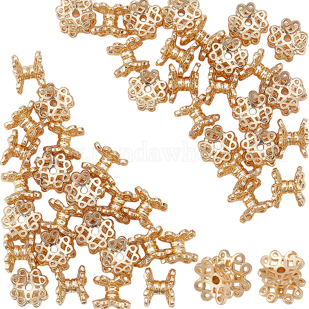 цветочные латунные двойные колпачки для бусин: около 6 мм в ширину, 6 мм длиной, толщиной 4 мм , отверстие : 0.9 мм, 50 шт;