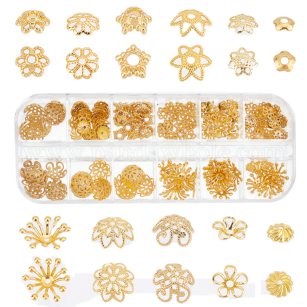 • Золотой 240 шт 12 стиль латунные колпачки для бусинок, цветок, золотые, 3~13x0.8~10 мм, отверстие : 0.8~7 мм, 20 шт / стиль