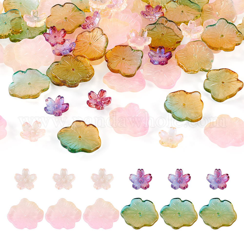 100шт. 4 стили, колпачки из прозрачного стеклянного бисера с покраской, запеченные в печи, 5-лепестков цветка, с блеском порошок