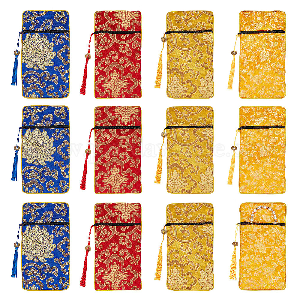 12 шт 4 цвета этнический стиль парча сутра книга сумка на молнии, двухслойные утолщенные сумки с кисточками для хранения Священных Писаний, прямоугольник с цветочным узором (02G7XC)