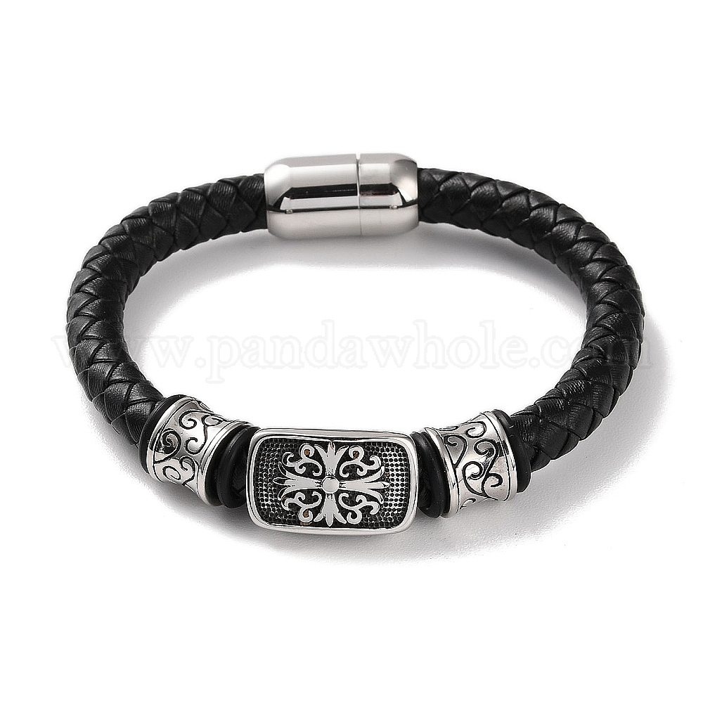 • Античное Серебро Мужские плетеные черные браслеты из искусственной кожи, цветок 304 браслеты со звеньями из нержавеющей стали и магнитными застежками, античное серебро, 8-1/2 дюйм (21.5 см)