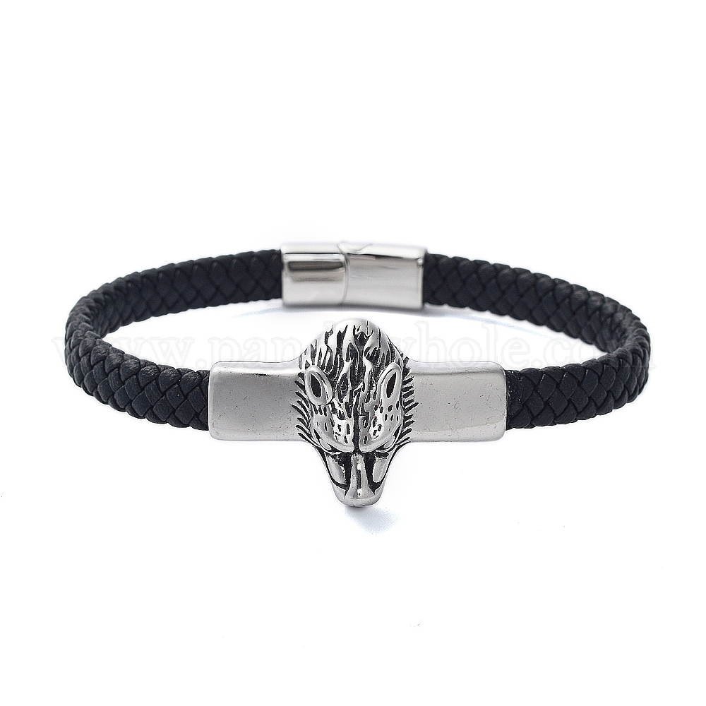 Мужские плетеные черные браслеты из искусственной кожи, голова волка 304 браслеты со звеньями из нержавеющей стали и магнитными застежками