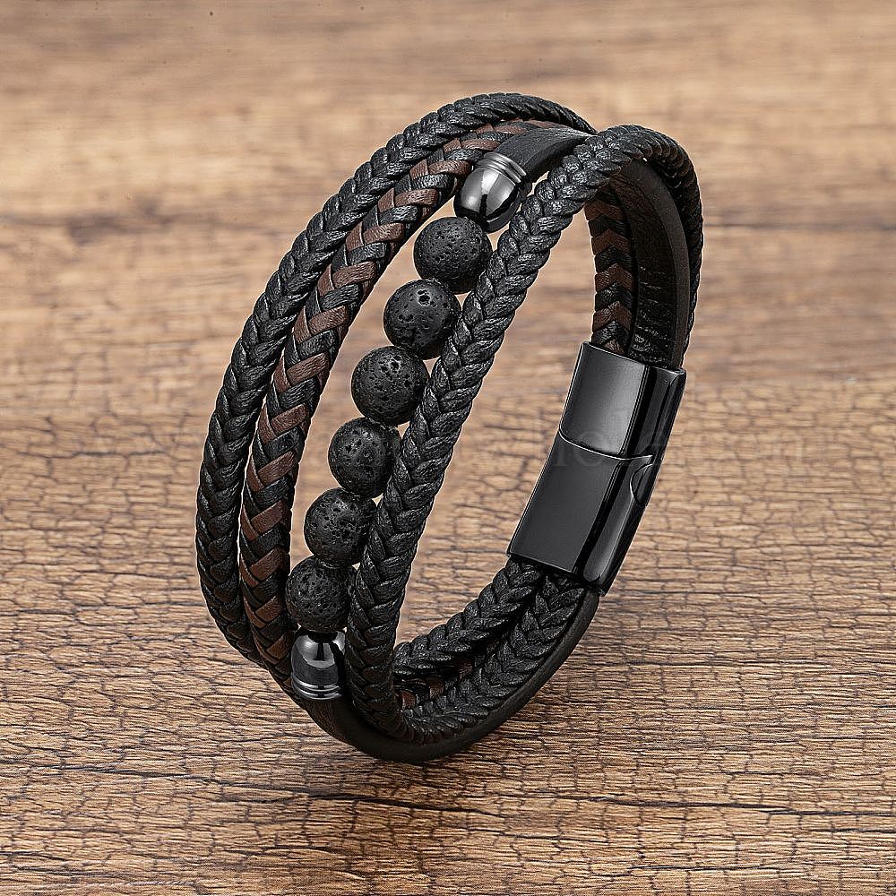 Браслеты из натуральных круглых бусин и плетеного шнура из искусственной кожи для мужчин, с 304 из нержавеющей стали магнитной застежкой, чёрные