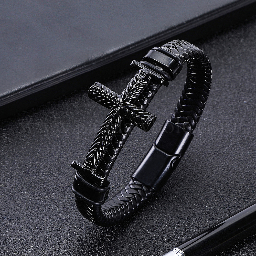 • Черный Плетеные браслеты из искусственной кожи для мужчин, крестик, с магнитной застежкой сплава, чёрные, 8-5/8 дюйм (22 см)