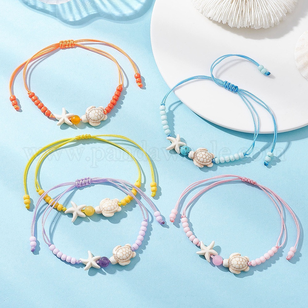 Регулируемые браслеты из натуральных смешанных драгоценных камней и стеклянного бисера в виде морской звезды и черепахи., смешанные окрашенные и неокрашенные