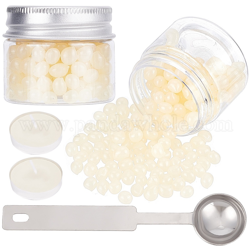 • (52) Непрозрачная лаванда 2 коробки овальные восковые гранулы, бусины из горячего расплавленного воска для винтажной сургучной печати, с 2плоскими круглыми свечами и ложкой из нержавеющей стали 1шт., разноцветные, гранулы воска: 0.55~0.6x0.5~0.55x0.5см, Около 201 шт / коробка