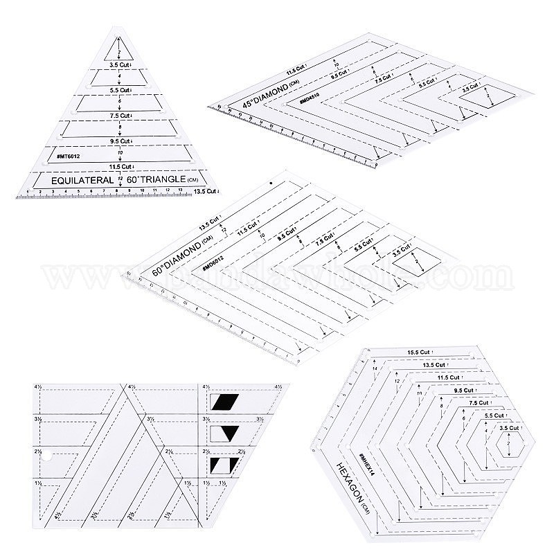 • Прозрачный 5 акриловая линейка для квилтинга, шаблоны трапеции/треугольника 60 градусов/шестиугольника/ромба 60 градусов/ромба 45 градусов, прозрачный пэчворк шитье ремесло линейка diy инструменты, прозрачные, 162~300x125~155x2.8 мм