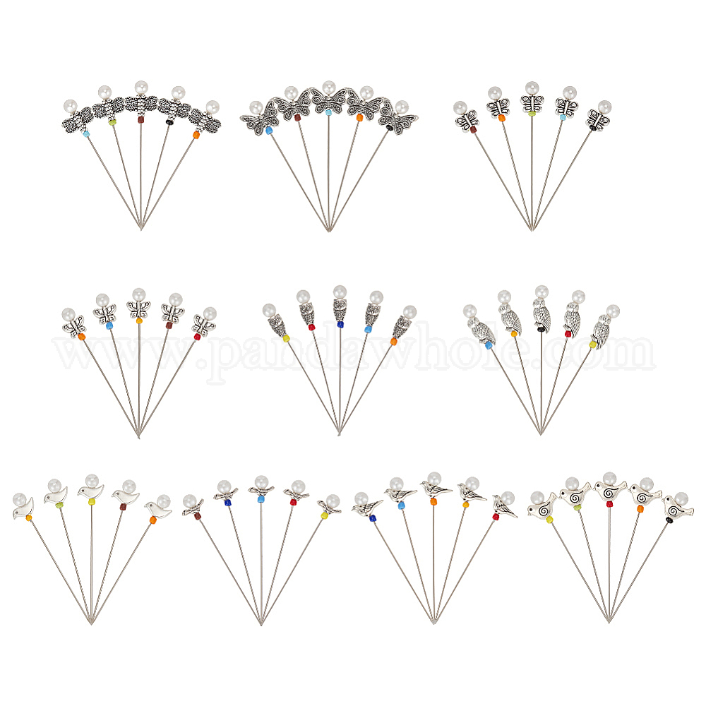 • Античное Серебро 50 шт. 10 стиль садовой темы булавки с железной головкой, прямые булавки с акриловой имитацией жемчуга и сплавом стрекоза/бабочка/птица, портнихи булавки, швейная булавка для поделок, античное серебро, 65 мм, штифты : 0.6 мм, 5 шт / стиль