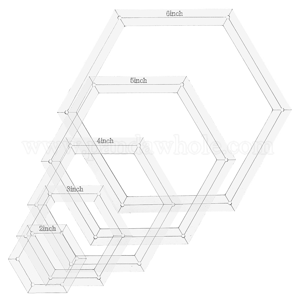 • Прозрачный 5шт. 5 стили шестиугольный акриловый трафарет для квилтинга, направляющая для резки, швейные инструменты, прозрачные, 44~132x51~153x3 мм, отверстие : 2 мм, 1 шт / стиль