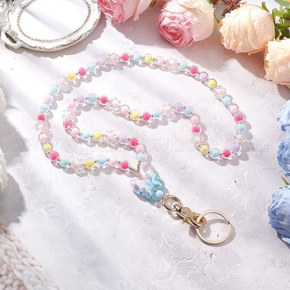 Держатели для карточек из акрила и круглых бусин, ремешок на шею, цепочка, с поворотными карабинами из цинкового сплава и разъемными кольцами для ключей из сплава, цветок и бабочка