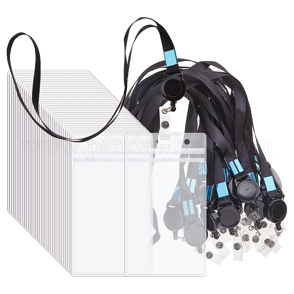 60шт. прямоугольные ПВХ держатели для визитных карточек, с 60шт. катушкой для бейджа из АБС-пластика с полиэстерными шнурками