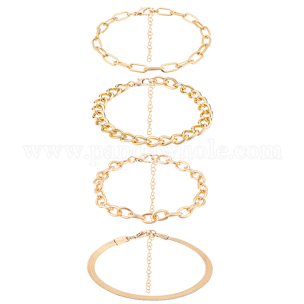 • Золотой 4шт 4 набор браслетов из сплава панцирного плетения, кабеля, скрепки и цепочки в елочку для мужчин и женщин, золотые, 7-1/8~7-1/2 дюйм (18~19.1 см), 1 шт / стиль
