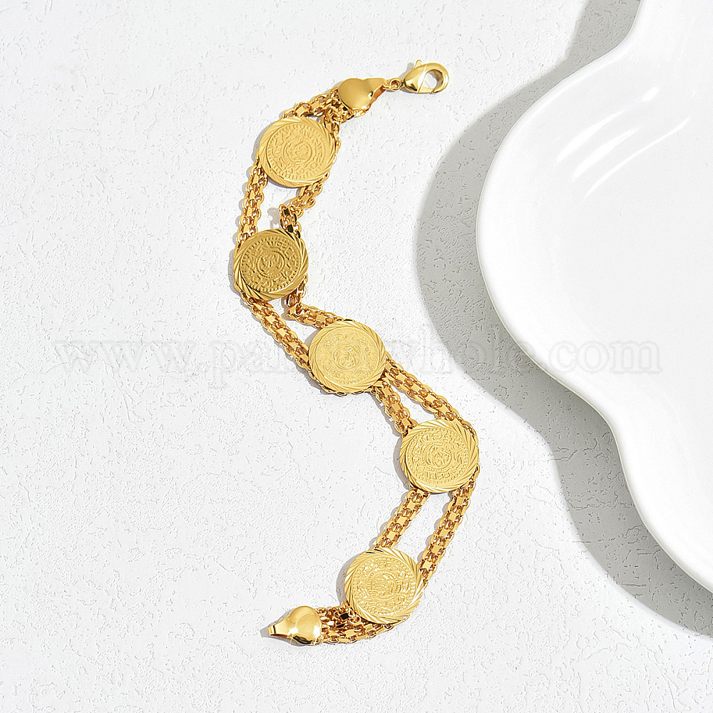 • Настоящее золото 18K Модные латунные двухслойные женские браслеты-монеты, реальный 18 k позолоченный, 7-1/2 дюйм (19 см)