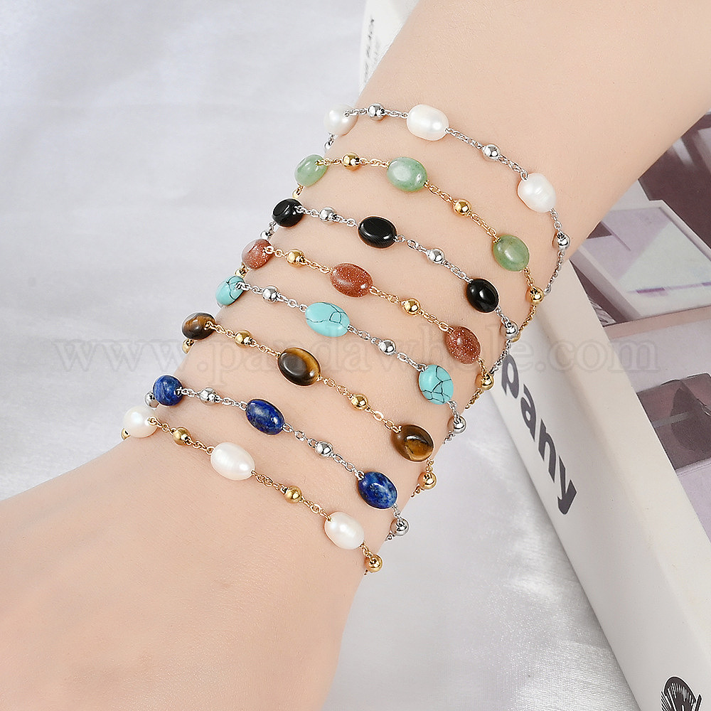 Браслеты ручной работы из нержавеющей стали с покрытием из настоящего золота 18k, украшенные драгоценными камнями и пресноводным жемчугом., ионное напыление (IP) для женщин