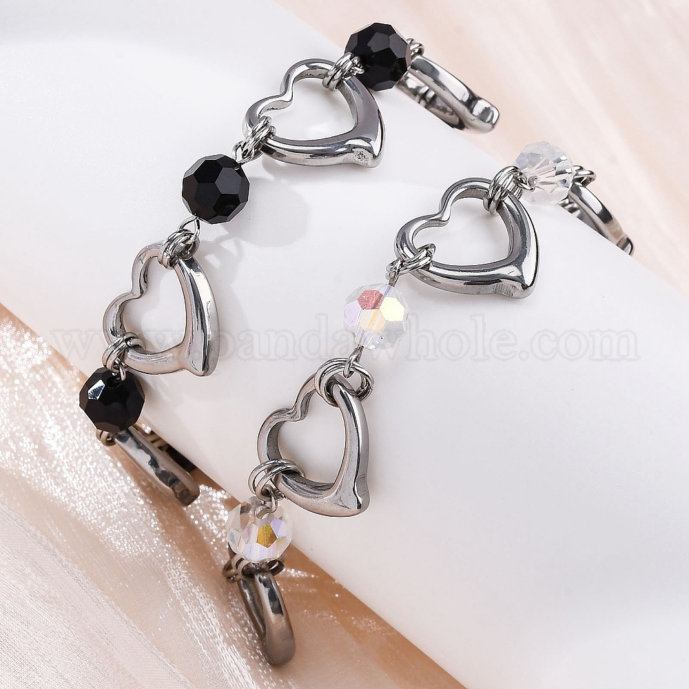201 нержавеющая сталь сердца ссылку цепи браслеты, Браслеты из стеклянных бусин с 304 застежками из нержавеющей стали