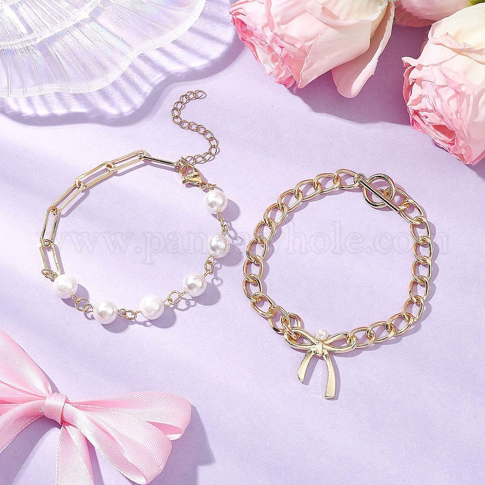 2шт. 2 стили бант алюминиевый витой панцирный браслет цепи и латунные скрепки и ракушки жемчужные цепи браслет набор для женщин
