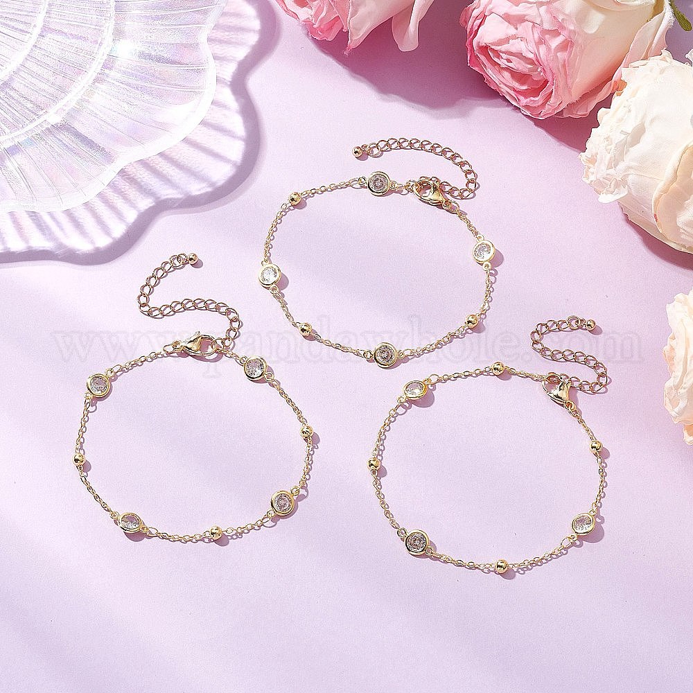 Плоские круглые браслеты из кубического циркония для женщин, с латунными цепями-сателлитами и 304 карабинами из нержавеющей стали