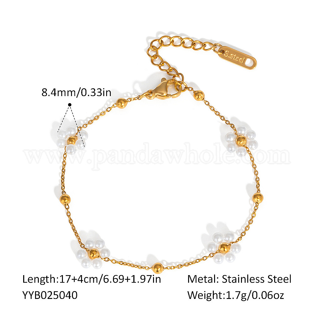 • Настоящее золото 18K 304 Браслеты-цепочки из нержавеющей стали с бусинами из искусственного жемчуга и белыми цветами для женщин, реальный 18 k позолоченный, 6-3/4 дюйм (17 см)