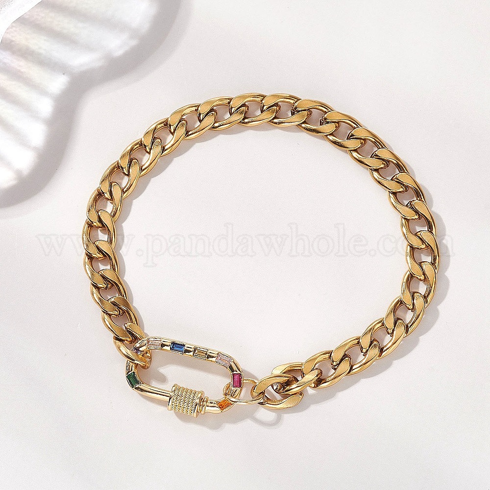 • Настоящее золото 18K 304 из нержавеющей стали кубинский ссылка цепи браслеты, Латунный микропаве кубический цирконий винтовой карабин ювелирное украшение для женщин, реальный 18 k позолоченный, 7.68 дюйм (19.5 см)