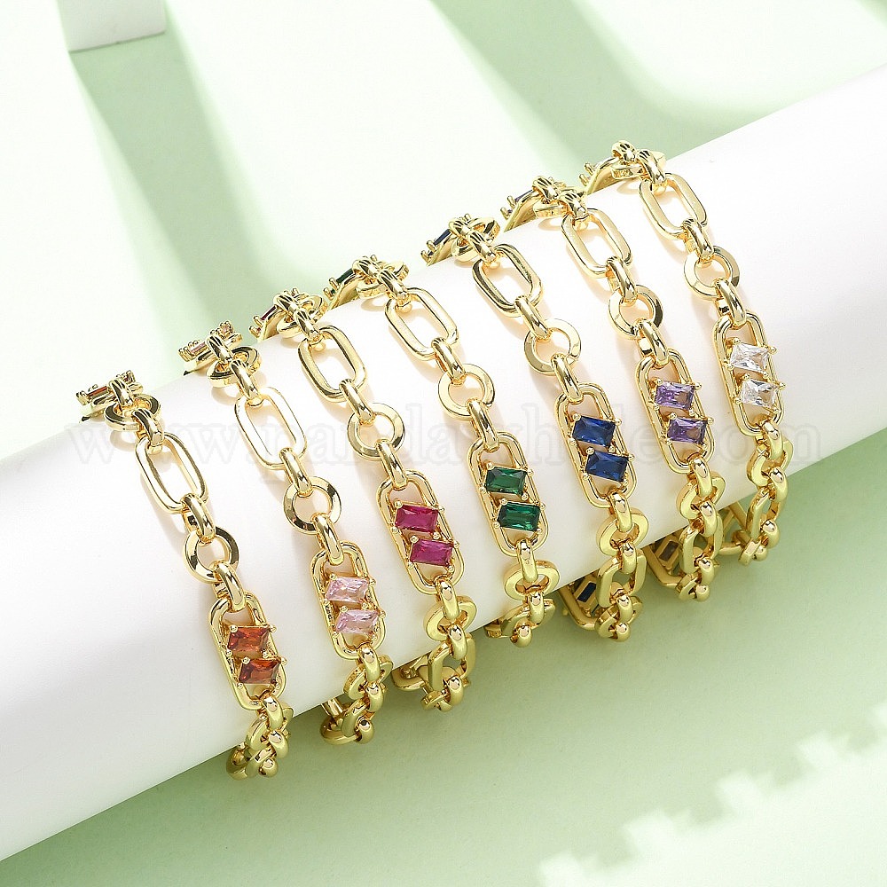 • Зеленый Браслет-цепочка из латуни в виде кольца и скрепки с микропаве из кубического циркония для женщин., реальный 18 k позолоченный, без кадмия и без свинца, стойки покрытие, долговечный, зелёные, 6.89 дюйм (17.5 см)