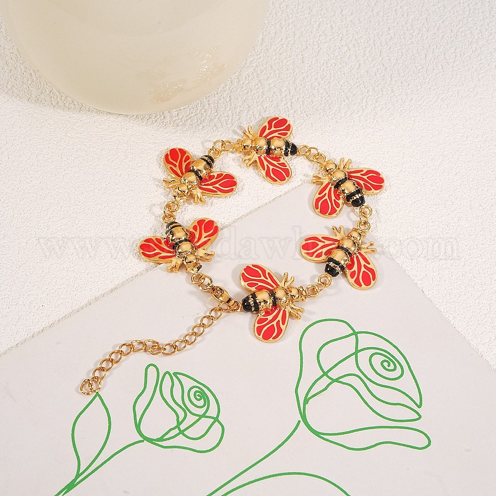 • Золотой 304 Браслеты-цепочки из нержавеющей стали с эмалированным покрытием для женщин, пчела, красные, золотые, 6.30 дюйм (16 см)