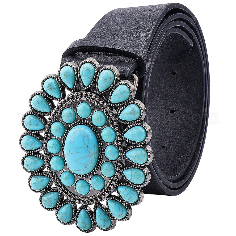 • Черный Цвет Металла 1Ремни из черной искусственной кожи с застежками из литого акрила, имитирующими бирюзовые цветы, для женщин, металлический черный , 1030 мм