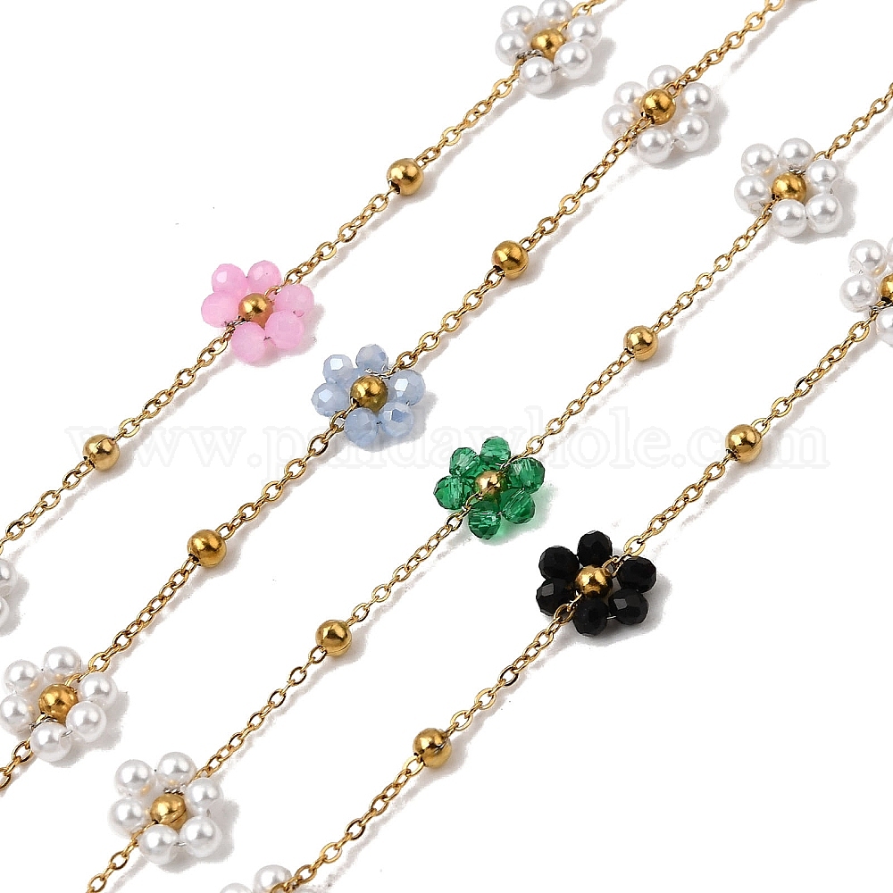 304 из нержавеющей стали цепи связи цветок, со стеклом и абс-пластиковым жемчугом, стойки покрытие, долговечный, ионное покрытие (ip), пайки, с катушкой, реальный 18 k позолоченный