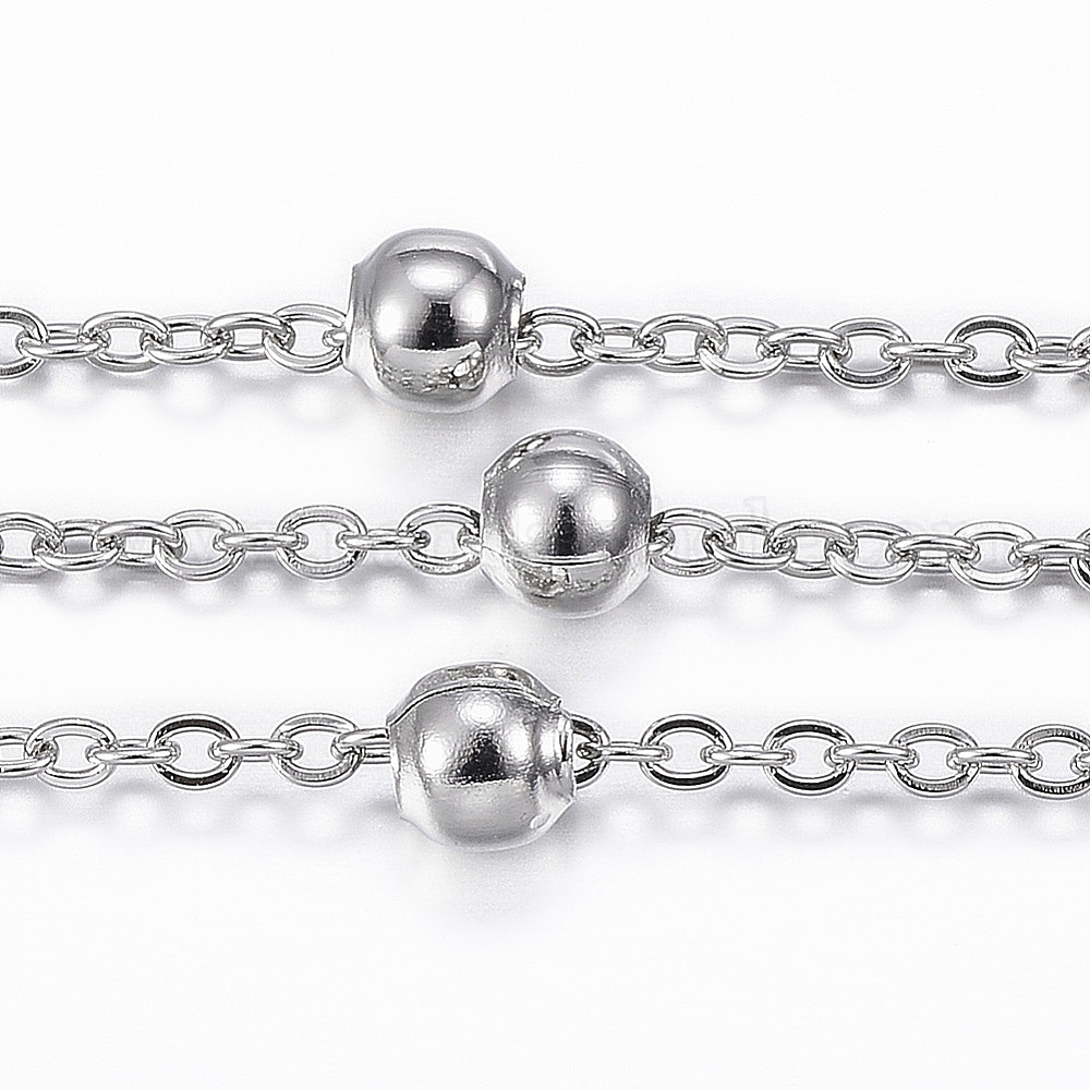 • Нержавеющая Сталь Цвет Устойчивы к потускнению 304 цепи из нержавеющей стали, спутниковые сети, со стальными круглыми бусинками, пайки, с катушкой, Плоско-овальные, цвет нержавеющей стали, 2x1.5x0.2 мм, около 65.61 футов (20 м) / рулон