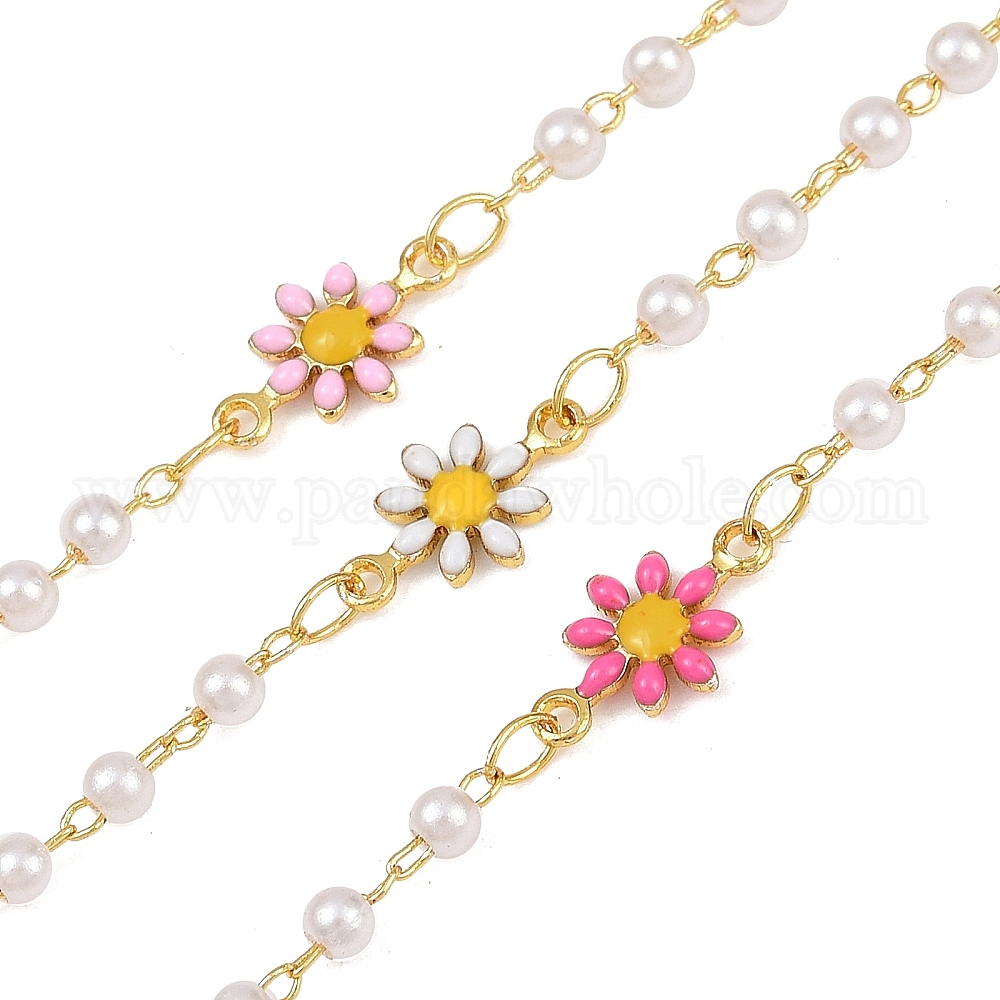 Латунные цепи с цветочными звеньями, с эмалью и имитация жемчуга абс, пайки, без кадмия, без никеля и без свинца, с катушкой