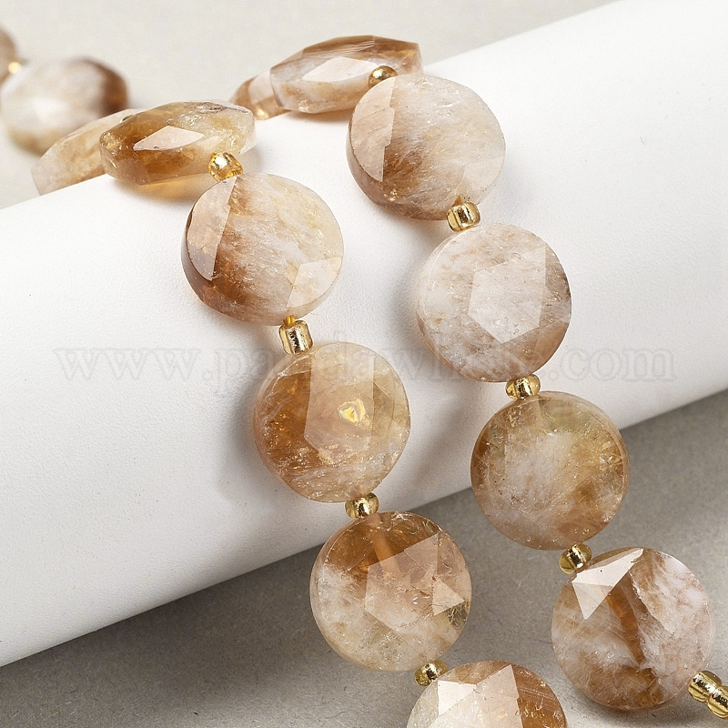 Нагретые нити из натуральных цитриновых бусин, граненый шестиугольный разрез, плоско-круглые, с бисером