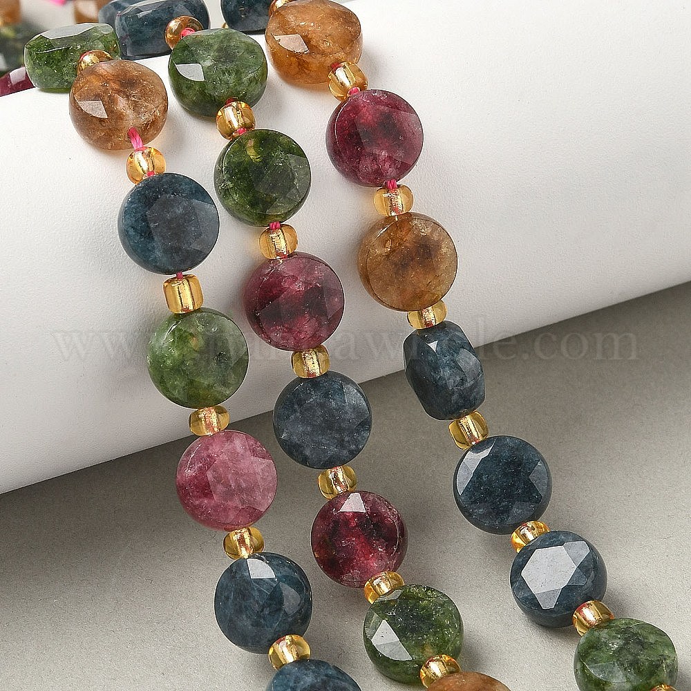 Нити из натуральных разноцветных турмалиновых бусин, граненый шестиугольный разрез, плоско-круглые, с бисером