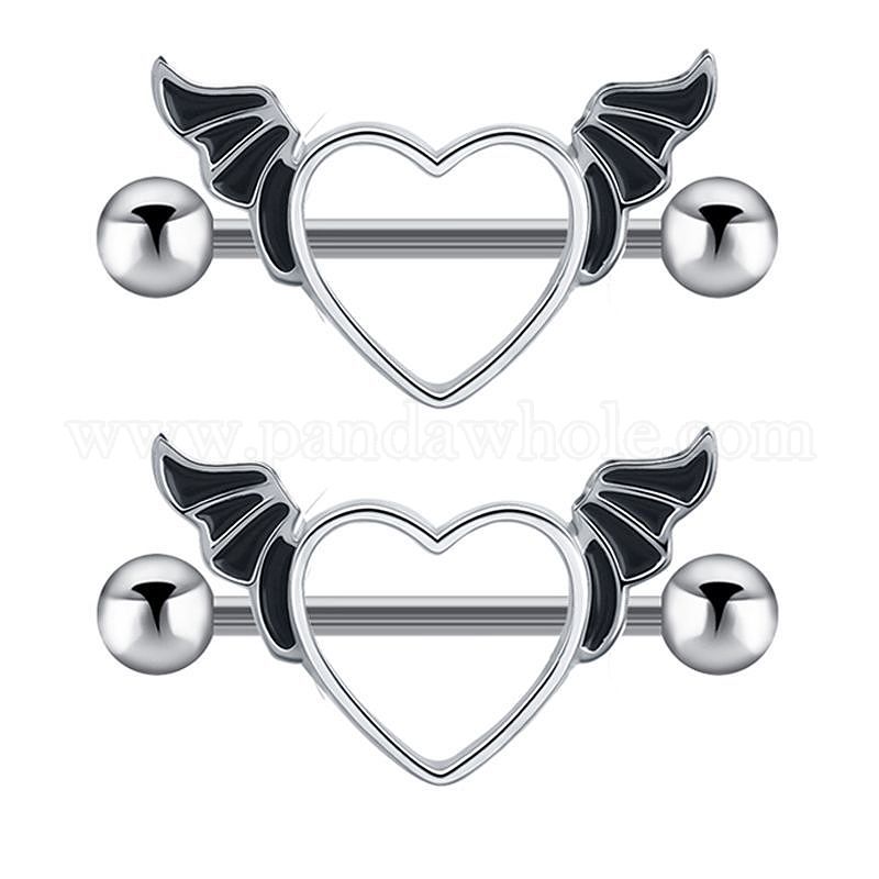 304 Кольца для сосков в форме сердца с крыльями из нержавеющей стали, черная эмаль, прутики для пирсинга сосков