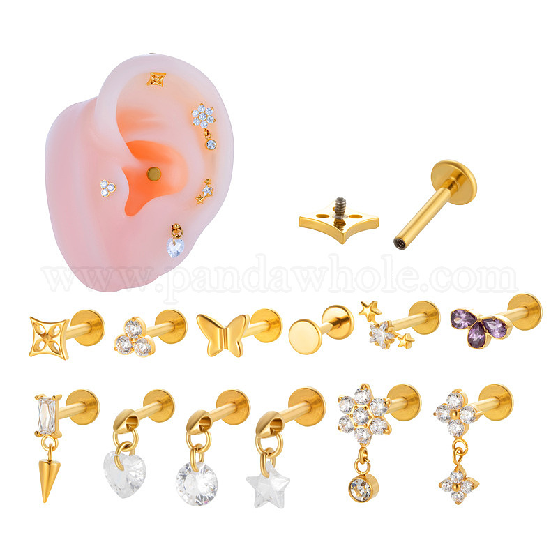 • Золотой Кубический цирконий из титанового сплава 17 калибр цветок лабреты с внутренней резьбой, пирсинг украшения для женщин мужчин, золотые, 8 мм, штифты : 1.2 мм