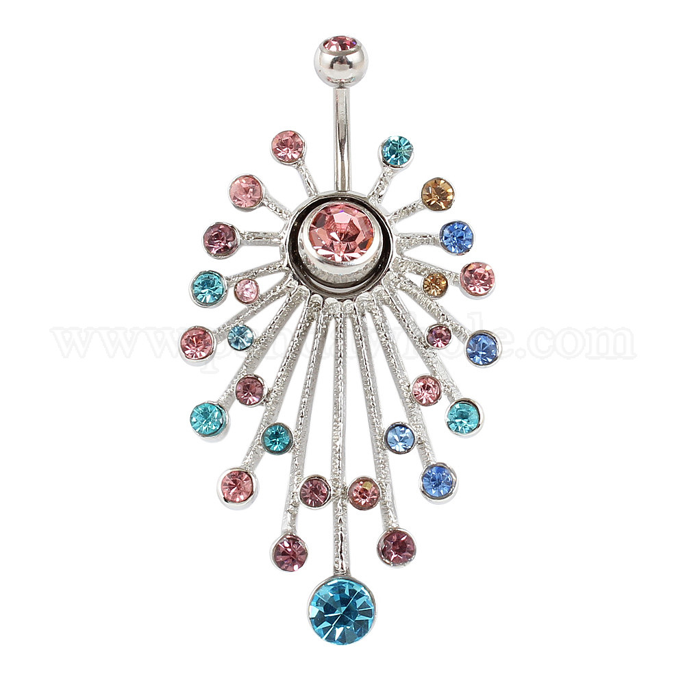 • Нержавеющая Сталь Цвет Кольца-колокольчики из сплава с цветочным принтом в виде изогнутой штанги и стразами, с 316l штифтами из нержавеющей стали, цвет нержавеющей стали, 10 мм, штифты : 1.6 мм