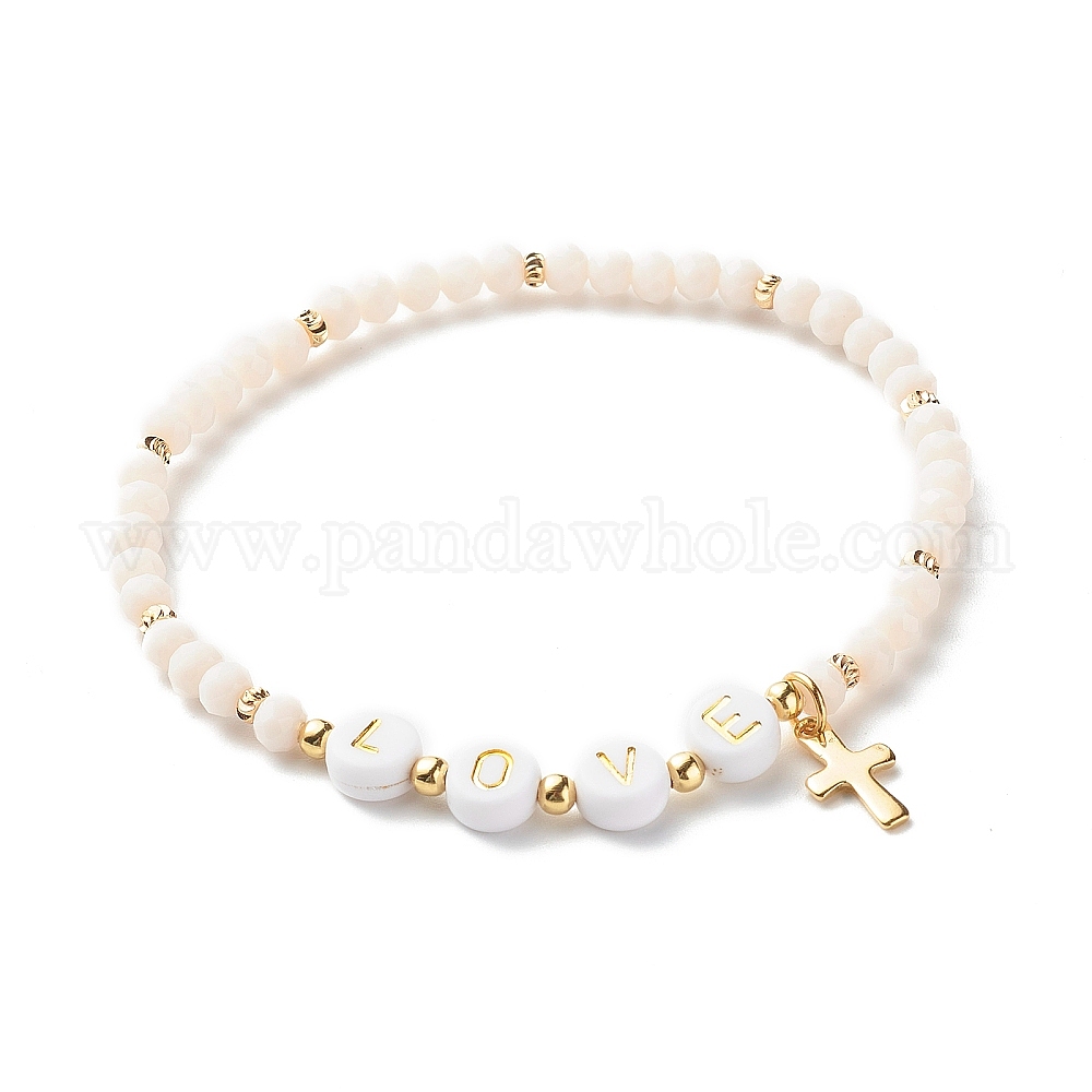 Стеклянные бусины растянуть браслеты, с акриловыми и латунными бусинами, 304 из нержавеющей стали крест прелести, Слово любовь