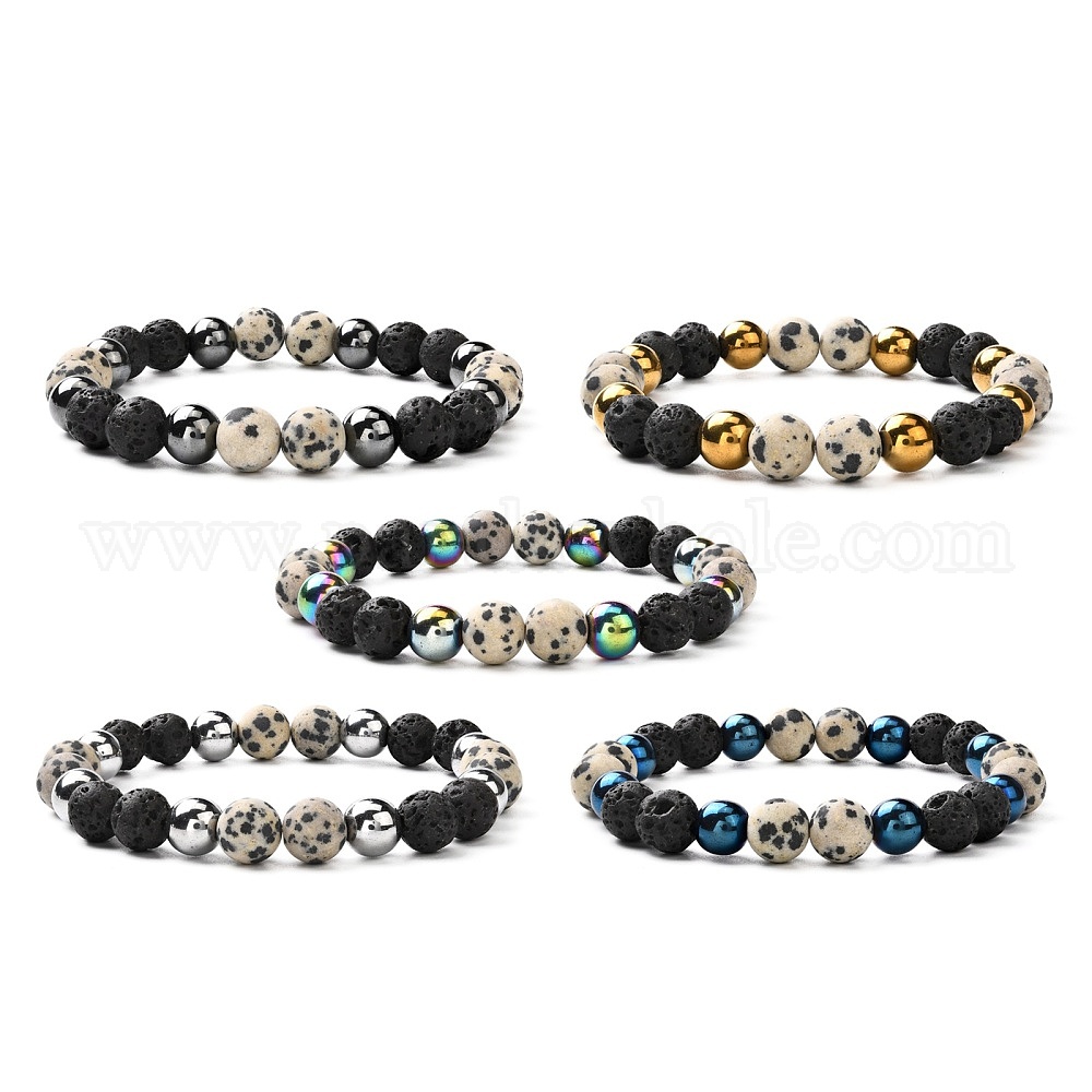 Матовые каменные круглые бусины эластичные браслеты для мужчин и женщин, браслеты из натуральной далматинской яшмы, вулканического камня и немагнитных синтетических гематитовых бусин