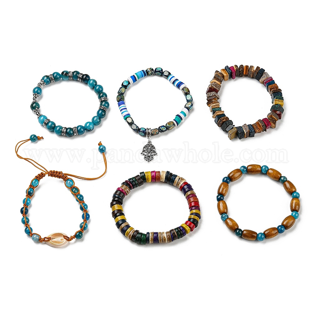 6 шт. 6 набор браслетов из натурального камня и деревянных бусин в стиле стрейч, плетеные браслеты из бисера из ракушек каури, браслеты с подвесками в виде рук хамсы / рук мириам, защитные браслеты Lucky Stackable для женщин (02AY68)
