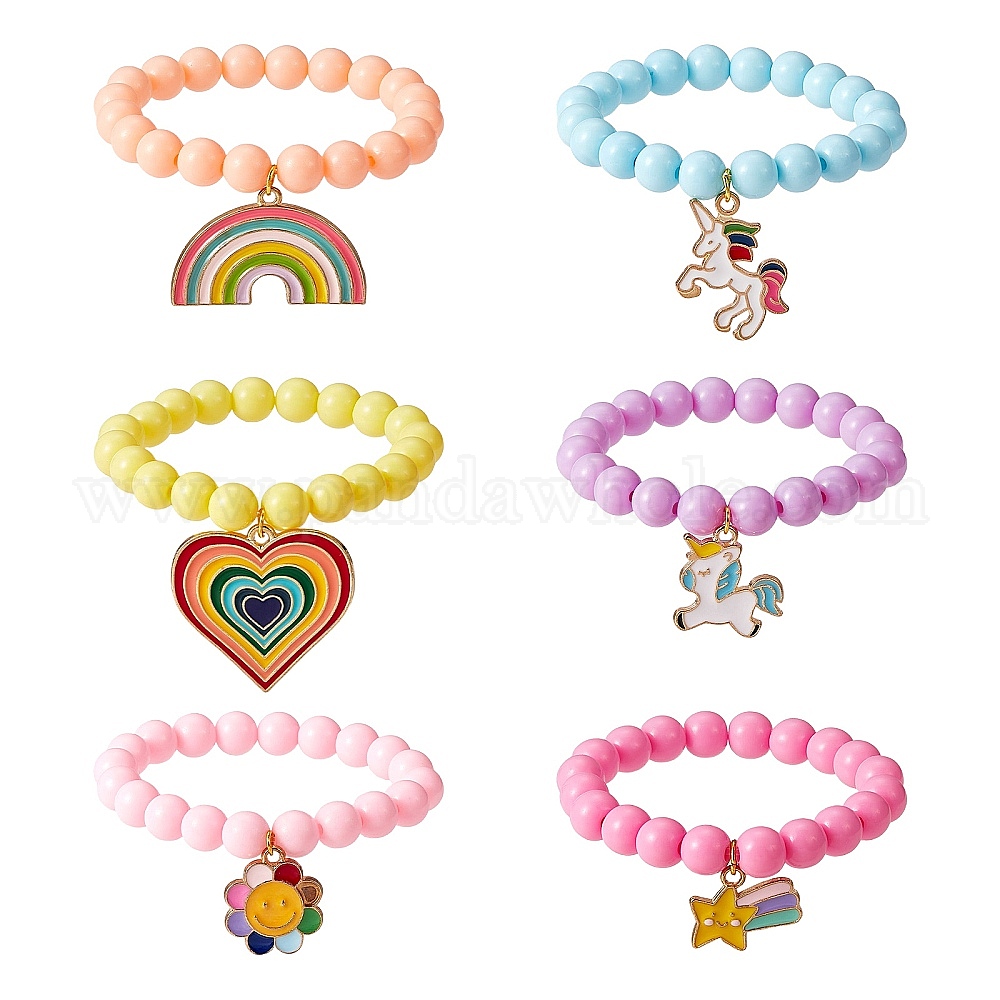 Акриловые круглые бусины ярких цветов, стрейчевые браслеты с эмалевыми подвесками цвета радуги для детей