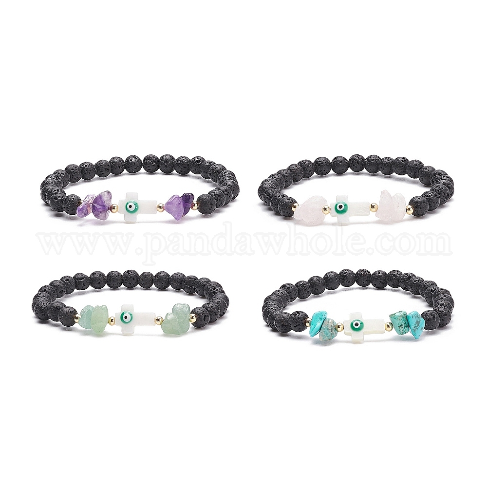 Эластичный браслет из бусин из натуральной лавы и драгоценных камней, браслеты из бисера из натуральных пресноводных раковин с крестом и сглаза