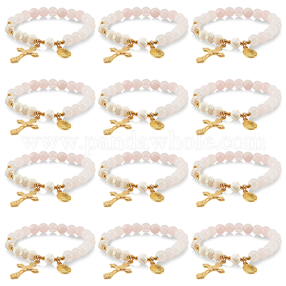 • Розовый Кварц Эластичный круглый браслет из натурального розового кварца и синтетической бирюзы с бусинами, Браслет для йоги с подвесками в виде креста и Девы Марии для женщин, внутренний диаметр: 2-1/8 дюйм (5.5 см)