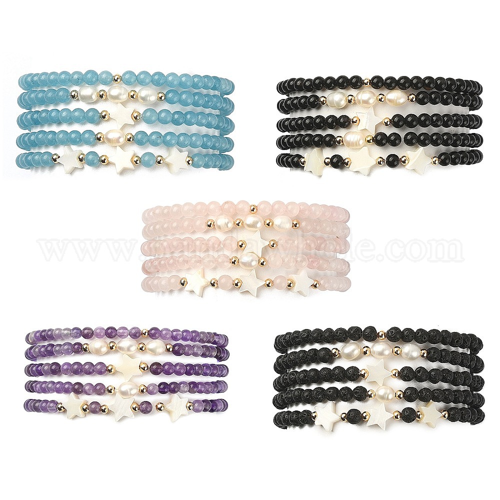 5 шт. 5 стиль, набор эластичных браслетов из натуральных и синтетических драгоценных камней, жемчуга и ракушек со звездами и бисером