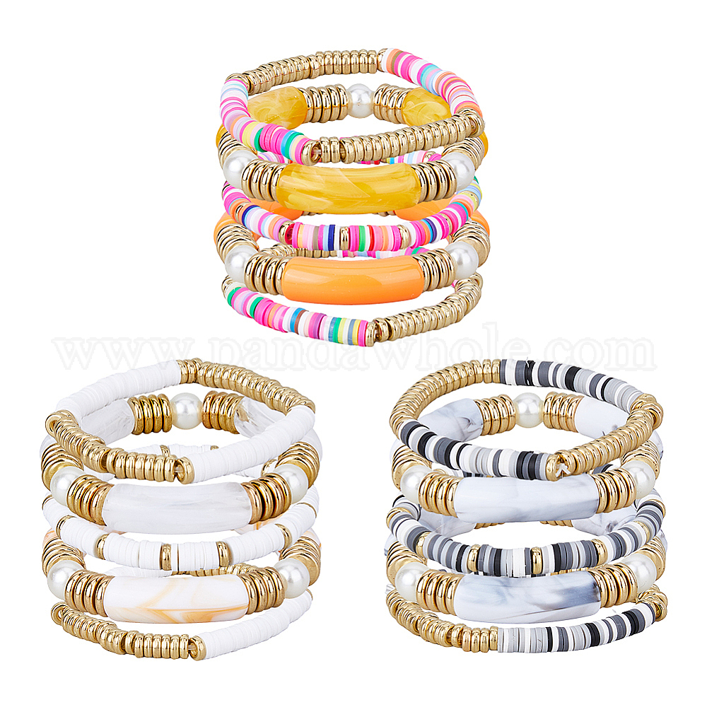 15шт 15 стиль этнический стиль полимерная глина heishi серфер растягивающиеся браслеты набор, акриловые изогнутые трубчатые браслеты