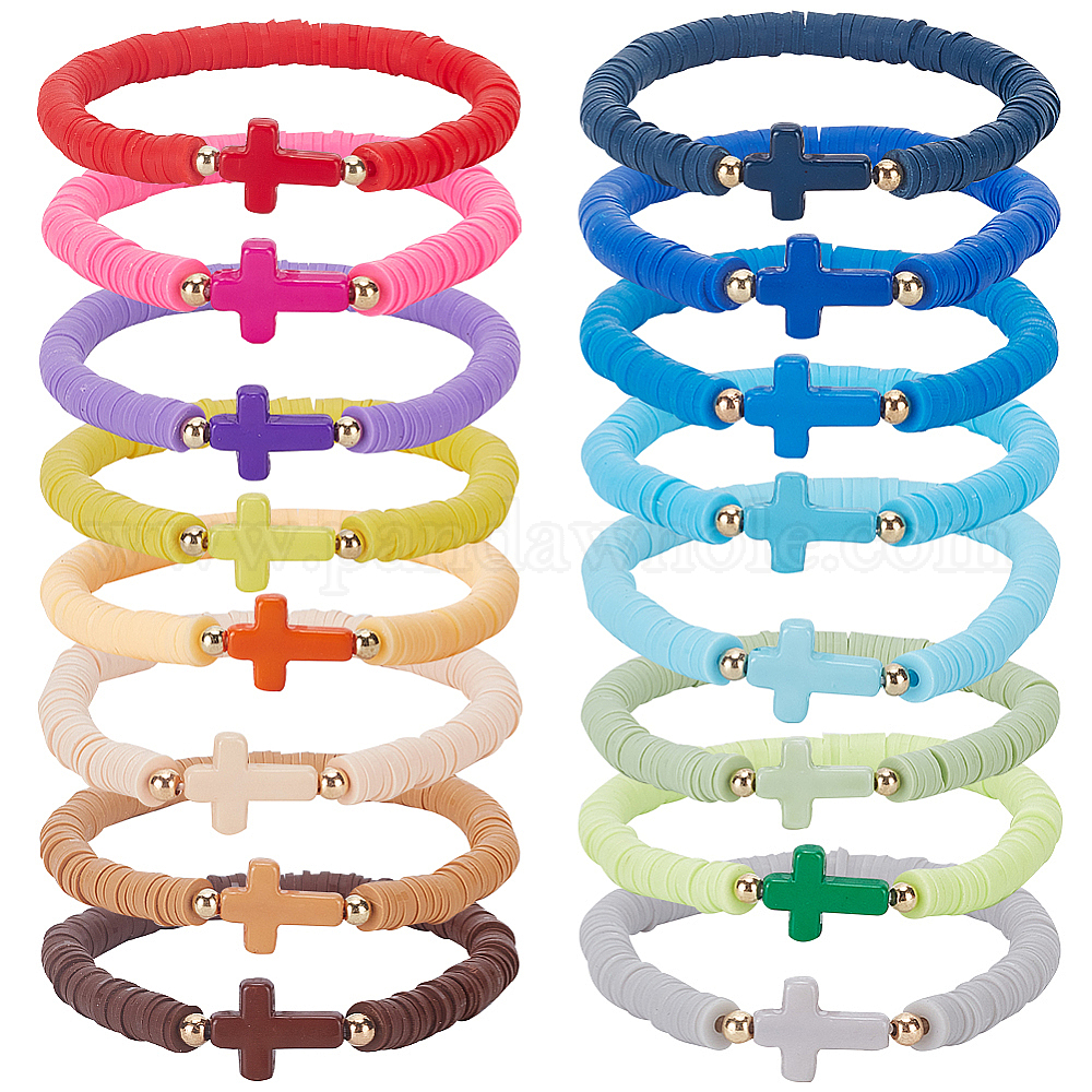 8 шт. 8 набор растягивающихся браслетов из цветной полимерной глины Heishi Surfer: внутренний диаметр около 1-7/8 дюйма (4.9 см), шириной 6 мм , крест: 15x12x4 мм, 8 шт / комплект, 2 цветов, 1 набор / цвет, 2 наборы;