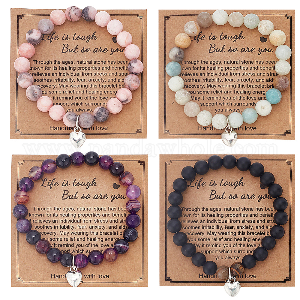 4шт. 4 стили браслеты из натуральных смешанных драгоценных камней с круглыми бусинами и подвесками в виде сердечек из сплава