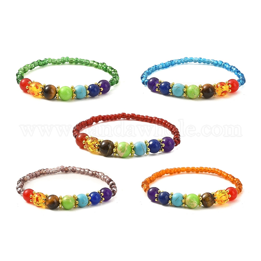 • (52) Непрозрачная лаванда Женский эластичный браслет из натурального смешанного камня и стеклянного бисера, разноцветные, внутренний диаметр: 2-1/4 дюйм (5.6 см)