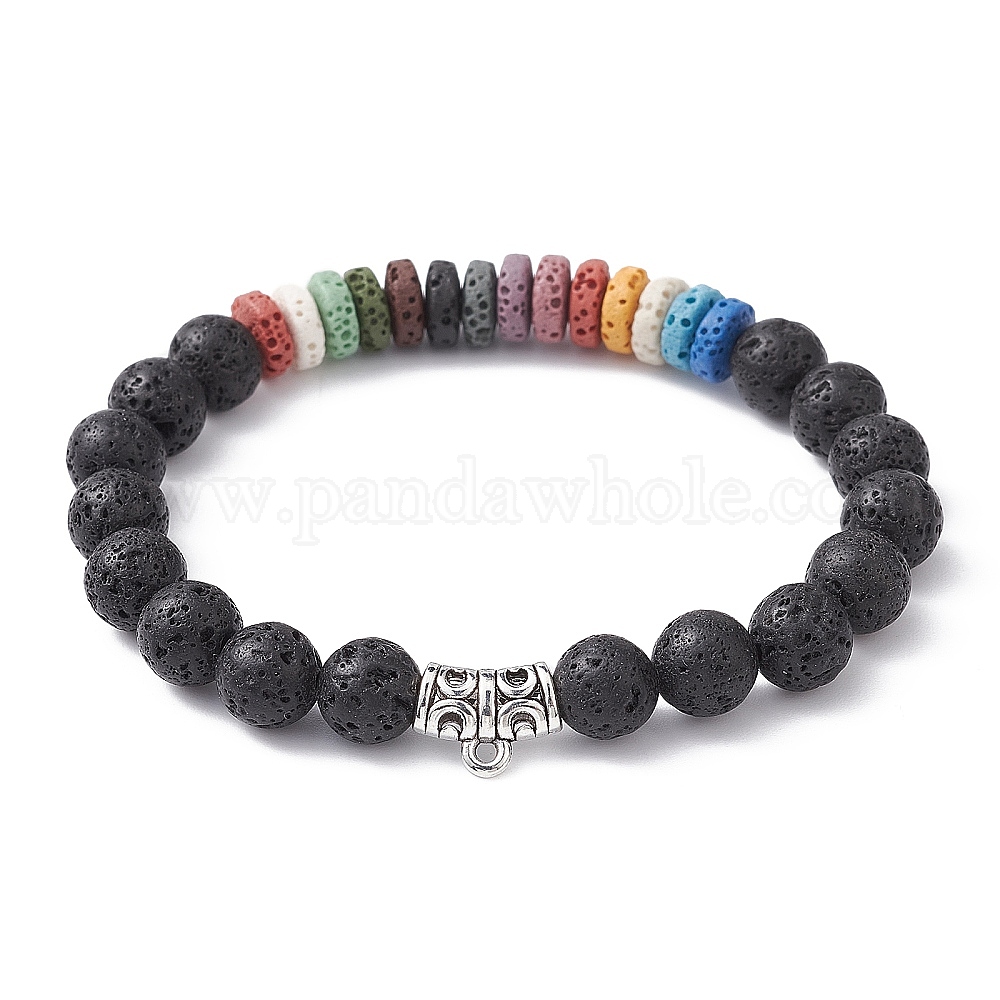 • Разноцветный Женские эластичные браслеты из окрашенного натурального лавового камня и бисера, с трубкой из сплава с бортиками, красочный, внутренний диаметр: 2-1/4 дюйм (5.7 см)